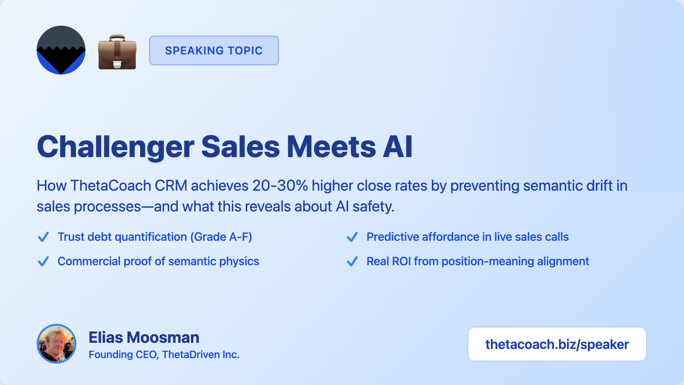 The physics of drift: why ungrounded meaning serves whoever shouts loudest—and the mathematical cure that gives you a floor to stand on. Meta-demo format: watch the CRM battle card work DURING the talk.