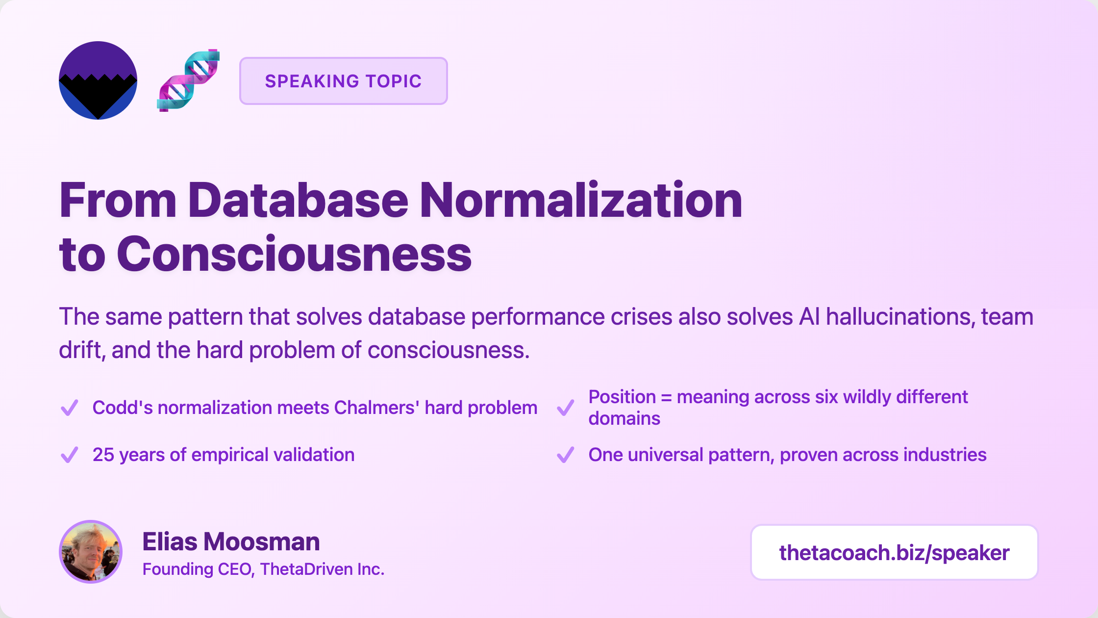 The same pattern that solves database performance crises also solves AI hallucinations, team drift, and the hard problem of consciousness.